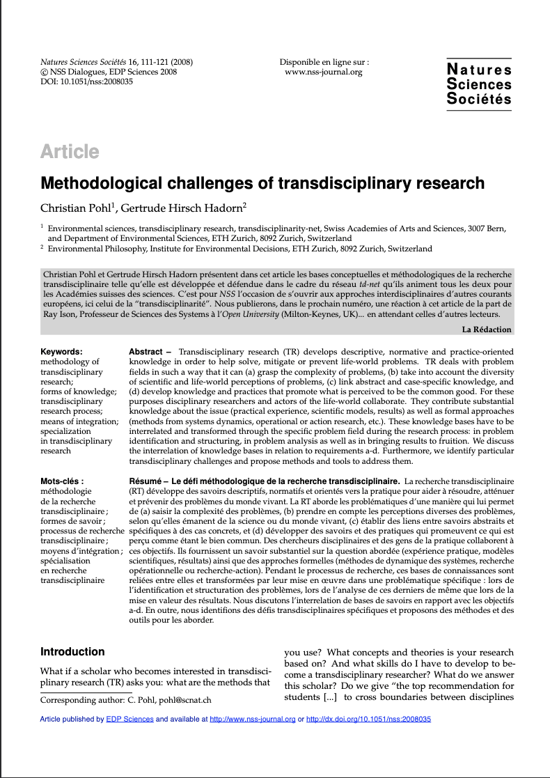 Transdisciplinary research (TR) develops descriptive, normative and practice-oriented knowledge in order to help solve, mitigate or prevent life-world problems. TR deals with problem fields in such a way that it can (a) grasp the complexity of problems, (b) take into account the diversity of scientific and life-world perceptions of problems, (c) link abstract and case-specific knowledge, and (d) develop knowledge and practices that promote what is perceived to be the common good.