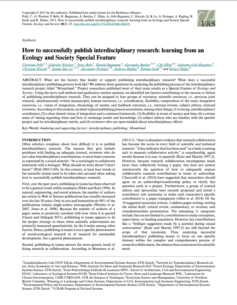 What are the factors that hinder or support publishing interdisciplinary research? What does a successful interdisciplinary publishing process look like? We address these questions by analyzing the publishing process of the interdisciplinary research project titled “Mountland.” Project researchers published most of their main results as a Special Feature of Ecology and Society.