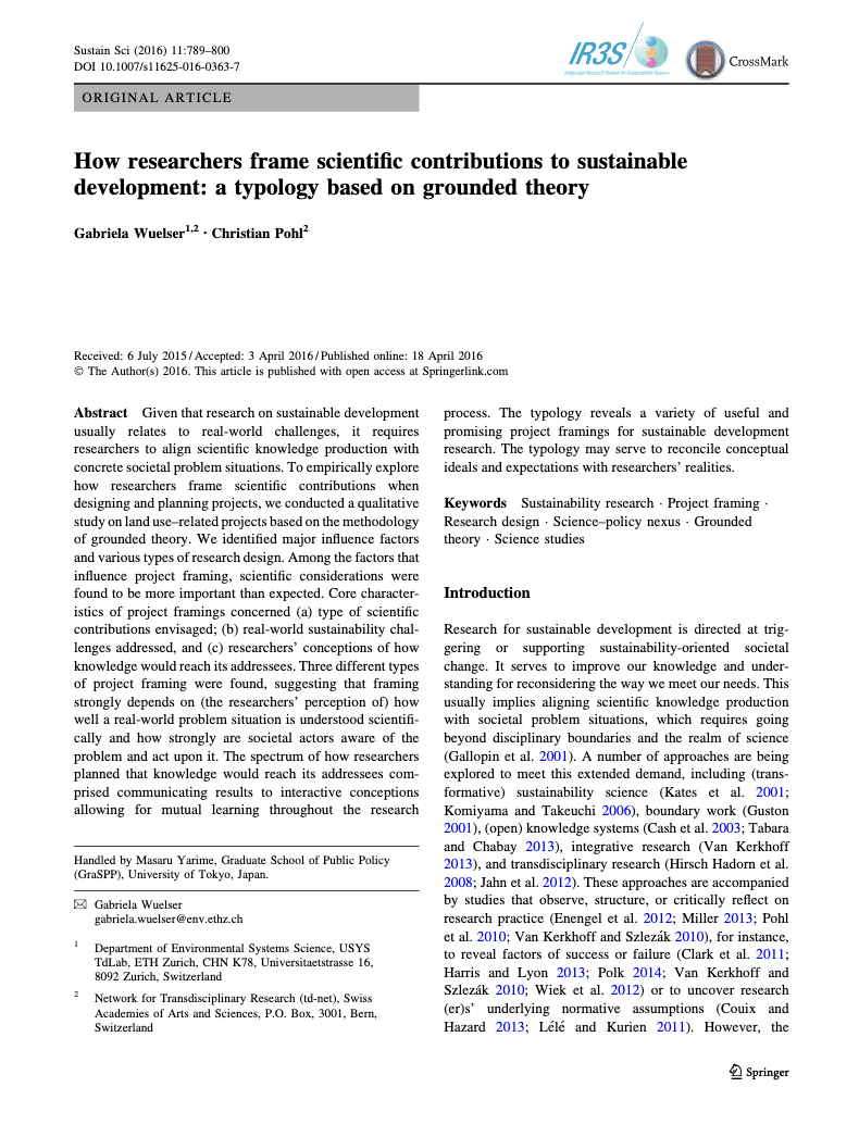 Given that research on sustainable development usually relates to real-world challenges, it requires researchers to align scientific knowledge production with concrete societal problem situations. To empirically explore how researchers frame scientific contributions when designing and planning projects, we conducted a qualitative study on land use–related projects based on the methodology of grounded theory.